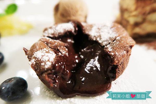 上桌的時候,想不到旁邊還擺上些許水果裝飾及一球冰淇淋,接下來輕輕滑開巧克力蛋糕,溫熱的巧克力醬緩緩地滑出,濃郁的香氣實在讓人難以抗拒啊!
