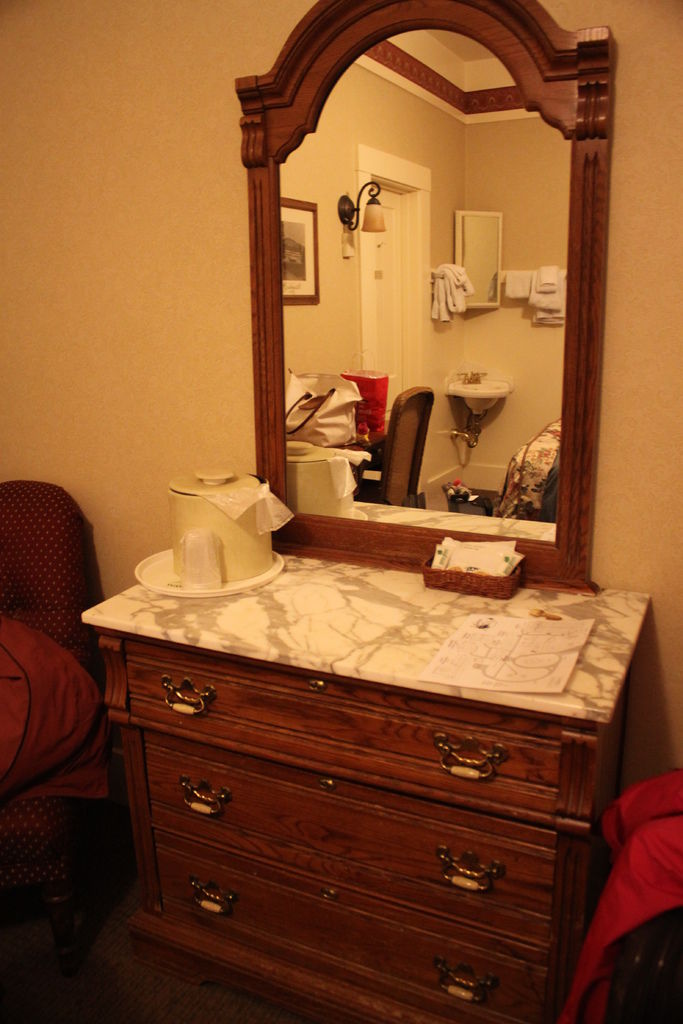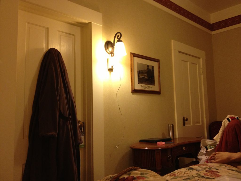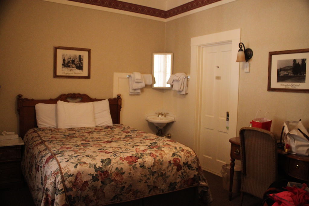 一開始在網路上看到這種花色的床單,頓時令人聯想到一種陳年房間的味道,但Wawona hotel出奇的乾淨@@+ 也完全沒有味道。 棉被下的羊毛毯還超級保暖的,晚上鑽進去就不想爬出來啦。