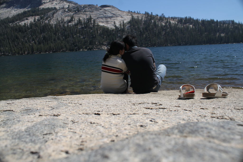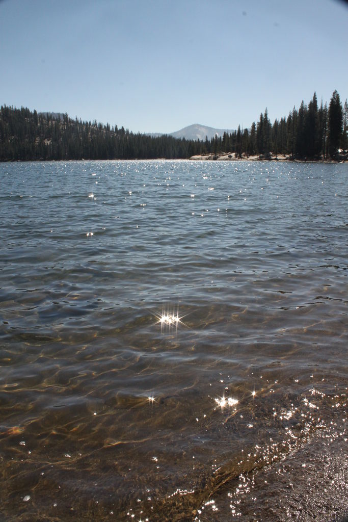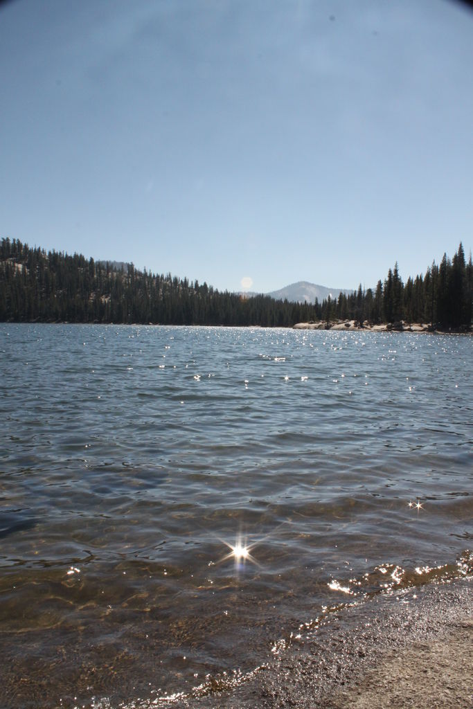 雖然他看起來很像被群山捧在手心的一顆藍寶石的,但其實印地安人給他的命名卻很保守:”閃亮山麓邊的湖泊”,誰叫花崗岩看起來真的很像下雪呢? 湖水超級超級清澈,讓我馬上脫了鞋要奔下去──