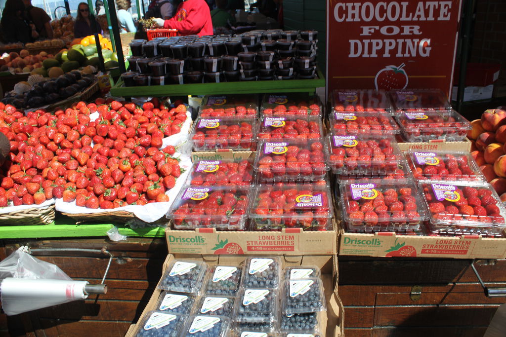 我點了一個草莓鮮奶油、跟巧克力口味的各一個。Pier39 上很多賣草莓的攤販,但那些草莓形狀像雞冠,有種肥料下太重的感覺,我看我這個蛋糕上面的形狀稍為正常。