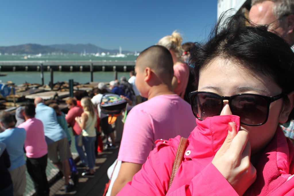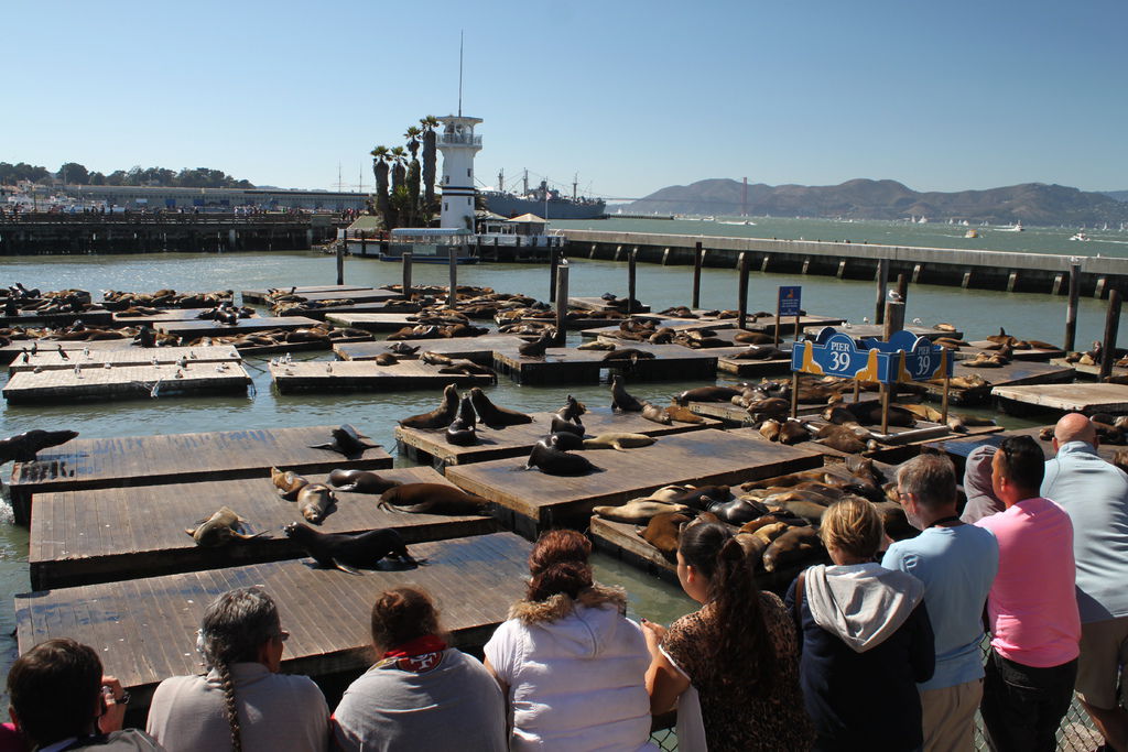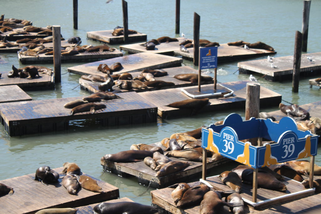 因為舊金山沿海地帶的開發使海獅的棲息地變少,政府就在pier 39漁人碼頭搭建浮板。陽光暖暖、海風徐徐,母海獅就像曬魚乾一樣陳列,公海獅則忙著爭奪地盤打架。 看他們打架滿精彩的唷! 尤其有些被推下浮板的海獅還會回來繼續挑釁。雖然很有趣,但這個景點頂多就待5分鐘了,沒有人會想沐浴在那樣的空氣下太久啦!!