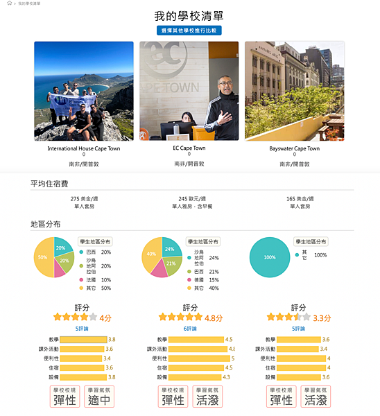可以選不同國家(共20+國家)然後不同城市的學校比較