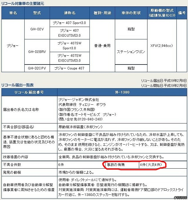 日本2007年發布407火災問題, 因為日本當時不進柴油車, 所以只能召回汽油款. (當時日本不進柴油車應該不是新聞)
