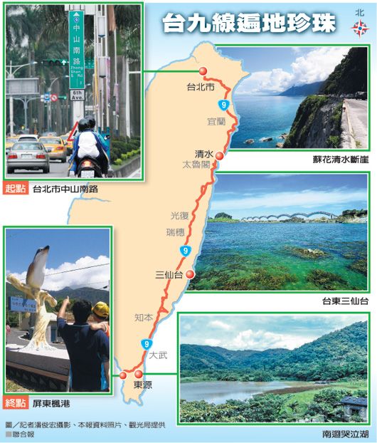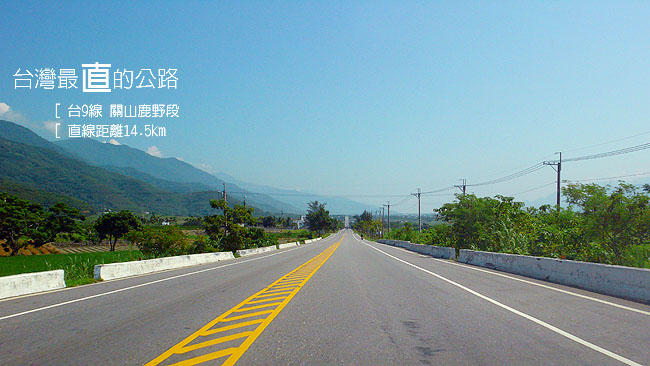 台灣 [ 最長 ] 的公路 - 台九線 = 全長 476.072 公里 .***夾層 - 台灣 [ 最長的公路直線路段 ] .台九線關山鹿野段 - 無彎道 14.5 公里 .***台九線起點台北市忠孝東西路與中山南北路交叉路口 .台一線 , 台一甲線 , 台三線 , 台五線 , 台九線五條省道 ,零公里起點全匯集在台北市忠孝東西路與中山南北路交叉口 ,這裡稱得上省道起源地 .資料來源 :http://blog.udn.com/webman/6927359終點屏東縣枋山鄉楓港村南迴公路高架橋下 .南迴公路高架橋完成之前舊路的台九線終點 .台九線舊路終點處同時也是台一線終點 .
