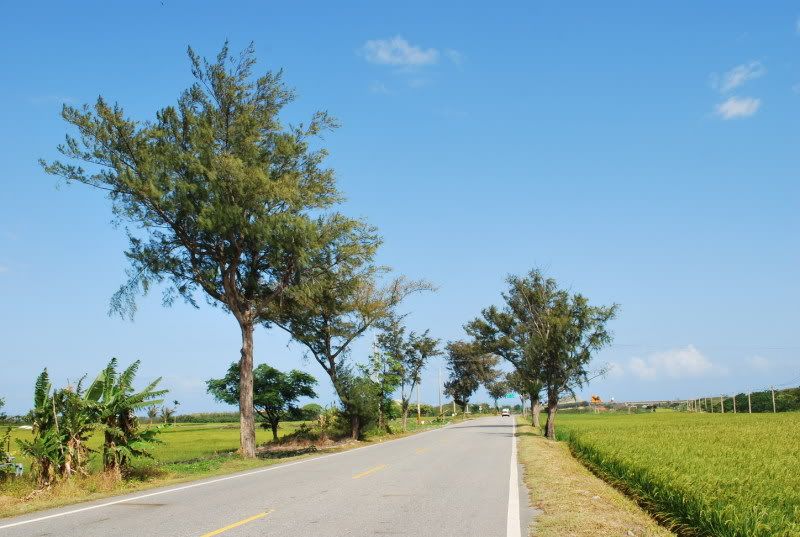 路邊是綠油油的稻田,映襯著蔚藍的天空