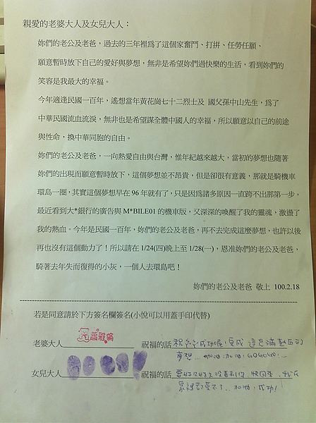 對於一個今年已過35歲的半老騎士,又有一個剛滿3歲的小女兒及偉大的女王,3天連假正是陪伴她們的大好時間,想要一人獨走,談何容易,只是為了這個夢想的實現,我還是非常正式的寫了一份請假單給她們!(僅供參考,不保證成功,無此需求可略過!)