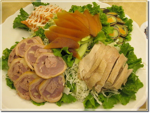 五福臨門(溪蝦、茶鵝、鹹豬肉、海蜇皮、炸魚片)