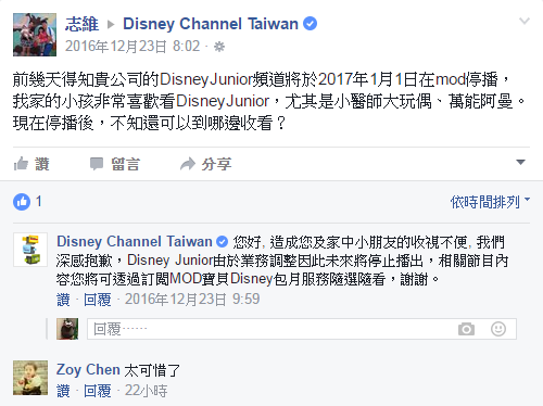 平常開機時數已經不算多了,剛發現小孩最愛的Disney卡通頻道不見了。 感覺種花公司對消費者的權益不太尊重,類似的案例已經好多次了,補上來的新頻道水準也不如之前。 應該不會再續約了,現在可以取代的方案也很多。