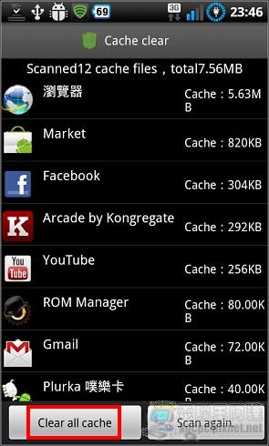 「Cache clear(清除快取)」軟體會檢查您裝置內所有程式所佔用的Cache,如下圖按下Clear all cache就可以清理出7.56MB的空間出來(按啟始畫面中間的「1-Click Clear」效果也一樣):