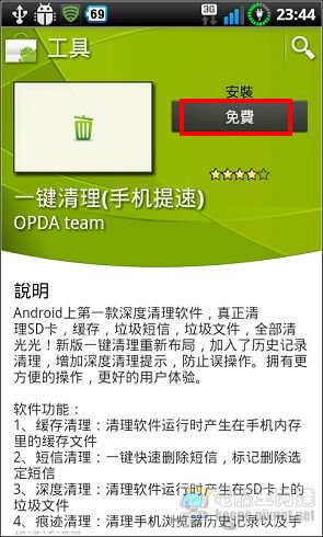 首先至Android Market搜尋「opda」並下載「一鍵清理」(FREE):
