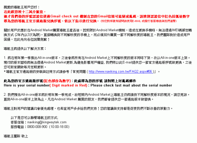 Dear All:之前測試時測試過公司信箱 GMAIL MSN等等的信箱皆沒問題,但只要透過GOOGLE CHECKOUT機制,所再轉寄到購買者信箱時,中文皆會變成亂碼,這可能是主機編碼定義的不同,我們正在嘗試如何成功寄出含中文的信件。PS:我們不會直接得知使用者的EMAIL,GOOGLE會給我們一組虛擬的購買者EMAIL,我們必須先寄到虛擬的EMAIL,GOOGLE才會再轉寄到實際的EMAIL信箱。以下為原始信件內容,可利用以下訊息對照亂碼信件,就可成功得到序號,當然我們也會繼續嘗試如何透過GOOGLE CHECK機制成功轉寄郵件出去。--------------------------(分隔線)-----------------------------------------親愛的導航王用戶:關於用戶反應於在Android Market購買導航王產品後,因為受限於Android Market機制,造成在更換手機時無法透過IMEI碼綁定轉換方式(2年內以3次為限),直接轉換到不同解析度的手機上,而必須另外購買一套不同解析度的導航王,我們團隊對於造成用戶困擾,在此先向各位說聲抱歉!導航王提供以下解決方案:1. 我們將在明年第一季上All-in-one版本,之後會將所有在Android Market上不同解析度的版本同時下架,改以All-in-one版本上架。現行的版本屆時將無法透過Android Market更新,為避免影響用戶權益, 我們特以此E-mail提供您一套官方通路版序號做更換,之後您可到官網做每月定期更新。導航王官方通路版的安裝與註冊方式請參考「常見問題(http://www.naviking.com.tw/FAQ2.aspx#06)」。此為您的官方通路版序號(紅色部份為數字) : 1a2b3c4d -->此處為序號,每個帳戶都會有一組獨一無二的序號2. 我們預估All-in-one版本將於明年第一季完成,故短期內Android Market上導航王仍將維持不同解析度版本的現況。請您諒解。直到All-in-one版本上架為止,凡在Android Market 購買的朋友,我們都會提供您一套通路版本作替換。導航王對用戶的建議均會優先處理,也希望用戶多多給我們支持!您的建議與支持都是促使我們不斷改善的原動力。以下是您可以聯繫導航王的方式;客服信箱:naviking@kingwaytek.com服務電話:0800-008-900(10:00-18:00)導航王團隊 敬上