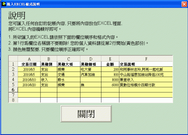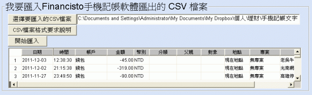 befdawn wrote:我自己是用finan...(恕刪) 您可以試試這套軟體「kapa直覺記帳」它支援financisto所匯出的文字檔有點遺憾的是financisto所匯出的文字檔是utf-8格式的文字檔,但我使用的工具只支援ansi.所以真要轉時還要手動將financisto所匯出的文字檔用記事本開啟後, 另存成 ansi 類型的文字檔才可以。附帶一提的是,如果您使用的是其它的記帳軟體資料, 又想要匯入到「kapa直覺記帳」這套記帳軟體也是可以的.只要把交易明細整理成格式符合下面的例子 EXCEL 檔就,任何資料都可以匯入.以上,