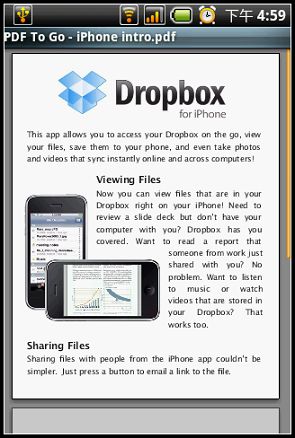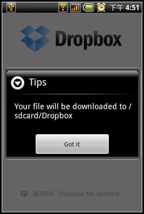 Android版跟iPhone版的Dropbox不同,iPhone版只能預覽檔案裡面的內容並不能下載到手機,但Android版Dropbox則是很大器的直接將檔案下載到記憶卡裡面: