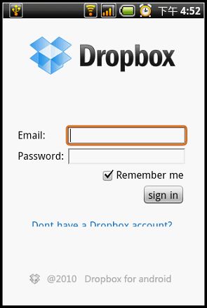 執行Dropbox會提示從Dropbox網路空間下載下來的檔案會統一放在記憶卡中的Dropbox目錄中,接著輸入帳號密碼(如果還沒有申請免費空間的朋友請點我):