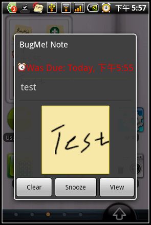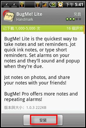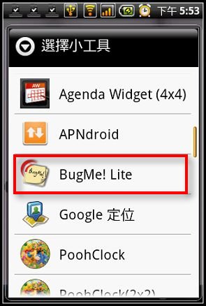 最後就是BugMe! Lite的實際應用,BugMe! Lite有WIDGET功能可以在主畫面上增加一個BugMe!的提示,讓你隨時都可以看到記事,也可以隨時新增: