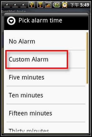 可以設定5分後、10分後...等時間後提示,但筆者習慣使用Custom Alarm(自己指定時間)提醒: