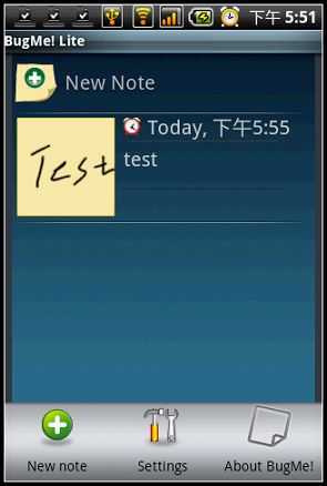 回BugMe! Lite主畫面後就會有記事列表,點選Menu也可新增記事或設定BugMe!的其他選項: