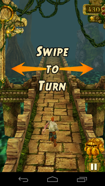 Temple Run,遊戲進去後會發現一個主角正被追殺,所以遊戲的步調非常快,讓玩家有種緊張的感覺,但是操作很簡單,只要在提示箭頭出現的時候,照著箭頭方向劃,就可以幫助主角順利轉彎。