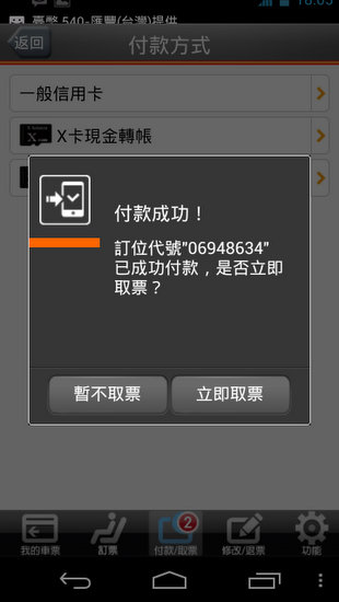 付款完成,點選立即取票,就可以在手機螢幕上看到高鐵電子車票;手機付款之後,在發車的半小時之前,都可以直接用「高鐵 T-EX」這個 App 辦理退票,免手續費。