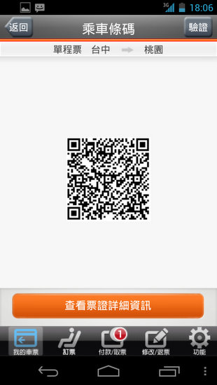 點選電子車票,進去之後就會看到 QR Code,在高鐵出入口的票卡感應區旁邊,有紅外線辨識器,直接將 QR Code 掃描,就可以用手機搭乘高鐵,非常便利!在 QR Code 下方點選查看票證詳細資訊,可以看到該電子車票的詳細狀況,如果需要報帳,請到高鐵車站的服務台,將票證資訊這一個畫面拿給服務人員,他們就會提供紙本的購票證明。