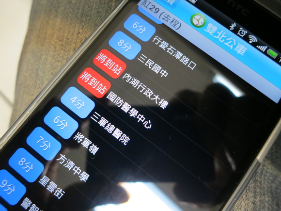▲ 一點進紅 29去程路線後,哇~!!紅 29會經過哪些站,各站車子到站還有多久,全部一目了然的秀在畫面上了!!這時還記得我們是進入「出門」這個群組裡要新增公車班次對吧,那麼從就我們出門時要上車的站名點選下去,耶魯熊就選了「內湖行政大樓」做為出門時要上站的站點