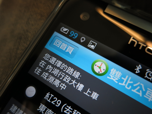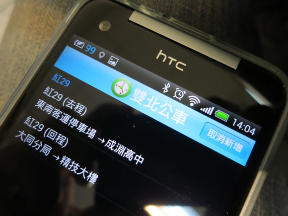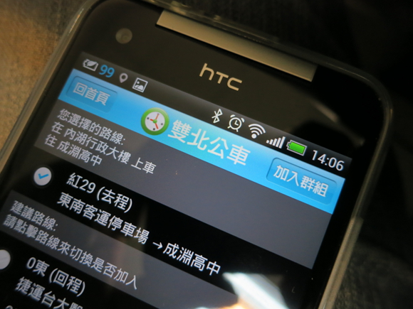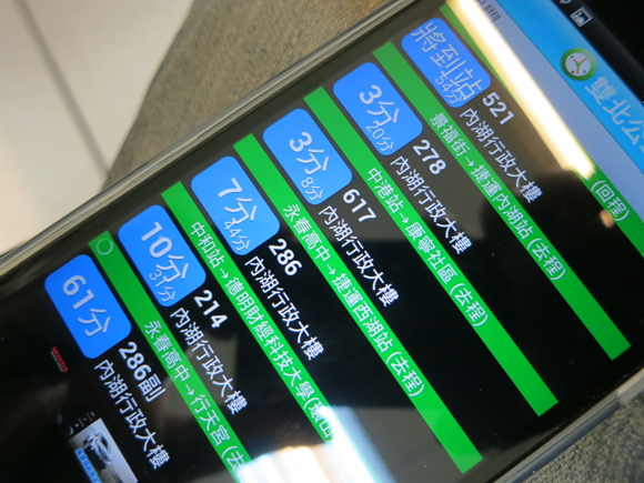 ▲ 回到程式首頁後,就會看到群組了,這時按一下剛剛新增了公車班次進去的「出門」哇賽~!! 剛剛新增的公車都秀在畫面上了,並且連還有多少時間會開到你要上車這站,也清清楚楚的秀在每班公車的最前方,真的是一目了然 !!!