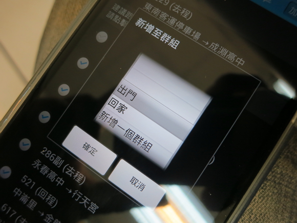▲ 這個時候程式會讓我們選擇要加入哪一個群組內,或是直接新增一個群組來放入這些勾選起來的公車班次,這裡耶魯熊就選擇「出門」這個群組,把剛剛的公車班次放進去
