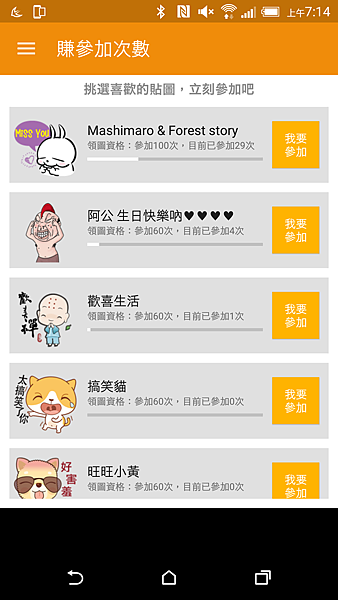 每張貼圖都有需要換取的參加次數(60次或100點),您只要多多參與,就能得到此貼圖。