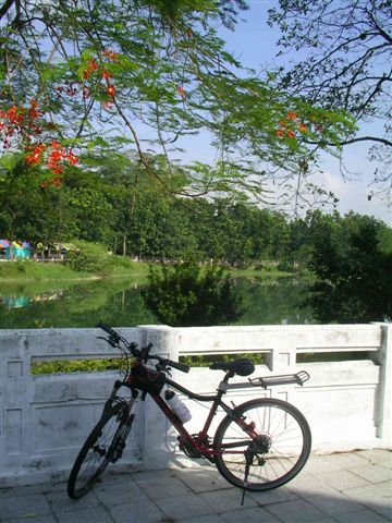 離開三信亭,應該要在嘉義大學校門左轉才能環湖,領騎卻疏忽地右轉滑下了一陣長坡,不幸地這表示我們得要再原路上坡,每次遇到下坡其實正是我最不安的時候,畢竟下坡越痛快,便意味著上坡越痛苦了,偏偏我又最不能騎山路,不禁開始後悔低估了環湖的難度,若不是對嘉義太過陌生,早在聖馬爾定醫院門口,便該知道自己的錯誤了,不過也正因如此,也才會第二次到訪蘭潭,也才有第一次造訪仁義潭的機會。