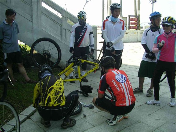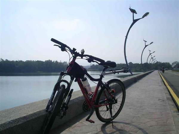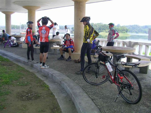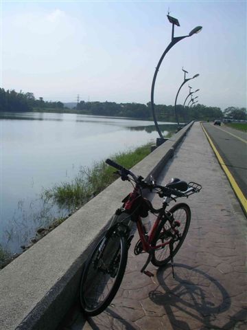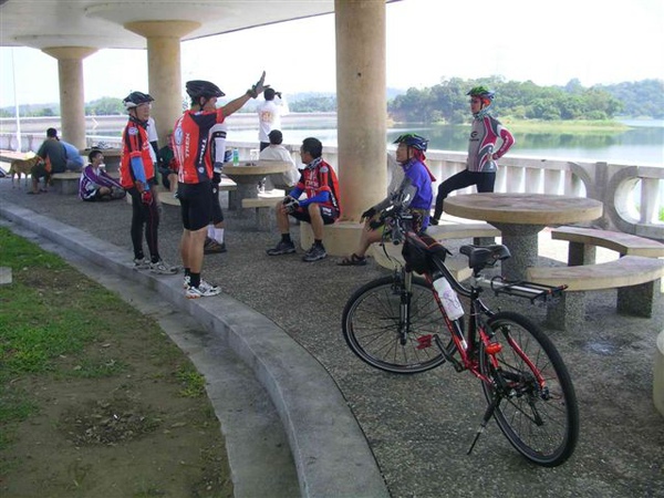 6:30準時出發後,一開始車隊以22km/hr的速度悠閒前進,穿越村落行經高鐵沿線,兩側熟悉的田園景致提醒著我已經許久沒有這麼早起運動,不過前面初升的朝陽倒是過分刺眼了。對於嘉義路況完全陌生的我,跟著隊伍騎了二十多公里,終於可以看見嘉義市街頭,也才在路旁公園短暫休息了一會兒,接著便又趕往嘉義高中對面的公車站與當地車友會合,然後便直上蘭潭三信亭與送茶水的semi6049碰面,在這邊享用美味的冷泡茶後,拍攝了團體紀念照,預定開始環湖,但據聞Matt的新防刺胎再次地破胎了,大概是路途中滿地的碎玻璃實在太難防範了,結果又藉著補胎之便在這樹蔭下多躲了一陣子。