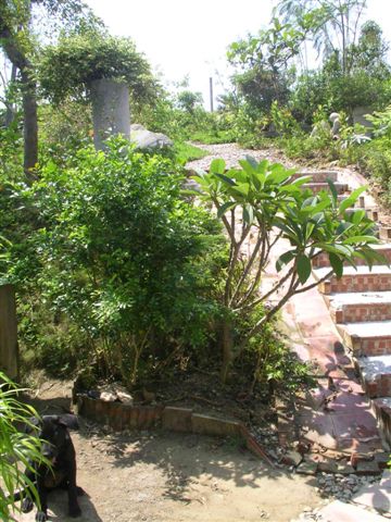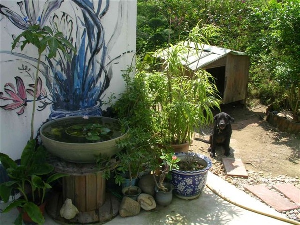進入桃城陶埕需要經過一小段土石地小坡,不勇壯的公路車就得下車牽行了,一進門便有三隻狗狗跑來迎接,是不是工廠也需要防範小偷呢?不過就連我們也被烈日烤得半熟,看門的小黑狗看起來也很需要補充水分呢!