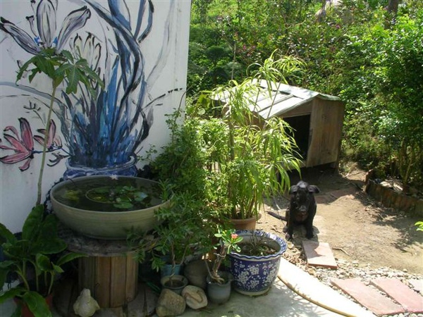 聽到狗叫聲,蔡永武馬上就出來迎接,讓我感到很高興的是,蔡永武也馬上認出我來,不知道是藝術家記性好?還是像他說的我幾乎都沒變呢?八年前有好一陣子我總是到廟前的北港小鎮叨擾他們一家,但北港小鎮營業不善而歇業後,我很快地前往台北,僅僅五年前在雲林縣文化中心的展覽會場偶遇一次,聽他說已經在蘭潭潛心創作,沒想到竟然能有這種意外的機會再次相見。