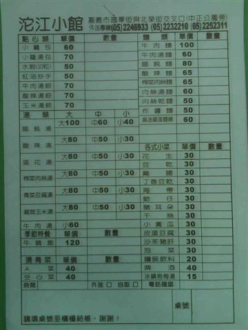 離開蘭潭,我們在十一點半抵達嘉義市,由於天氣實在太熱,最後決定在嘉義市用中餐,便選定位於紀念公園旁的沱江小館,看起來生意相當不錯,但是價格竟也是不遜於新竹的高價,我這時才知道笨港車隊的出遊規矩,在此每人繳交200元,用來給付今天的團體膳食費,不過用過午餐之後,便先從餘款退還給學生100元,不管到哪邊,作為學生總是承蒙大家關照了。
