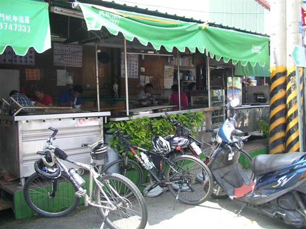 頂著大太陽,還要繼續騎回北港,日正當中騎車已經很消耗體力,加上往西竟然是一路逆風,讓人討厭的爬坡跟逆風一個都不缺啊!而且早上還以22kn/hr悠閒前進,隊伍卻在正午又逆風的狀況下直飆到25km/hr以上,像我這種肉腳回程時總是特別慢,但看來大家平日都訓練有素啊!因為太陽實在太大,隊伍在江厝店往新港的路上又暫時休息了一下,最後以吃冰為目標往新港市區騎去,前往似乎大家都很熟悉的粉條大王。