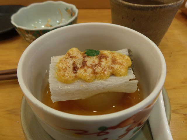 這個很特別,白蘿蔔切片上面是鹹蛋黃醬,下面包魚肉,魚肉下面還有一個圓形中空的蘿蔔包著魚漿,味道非常好,鹹蛋有點鹹鹹的很濃郁但又配上清新的蘿蔔和鮮嫩的魚肉,真是絕配