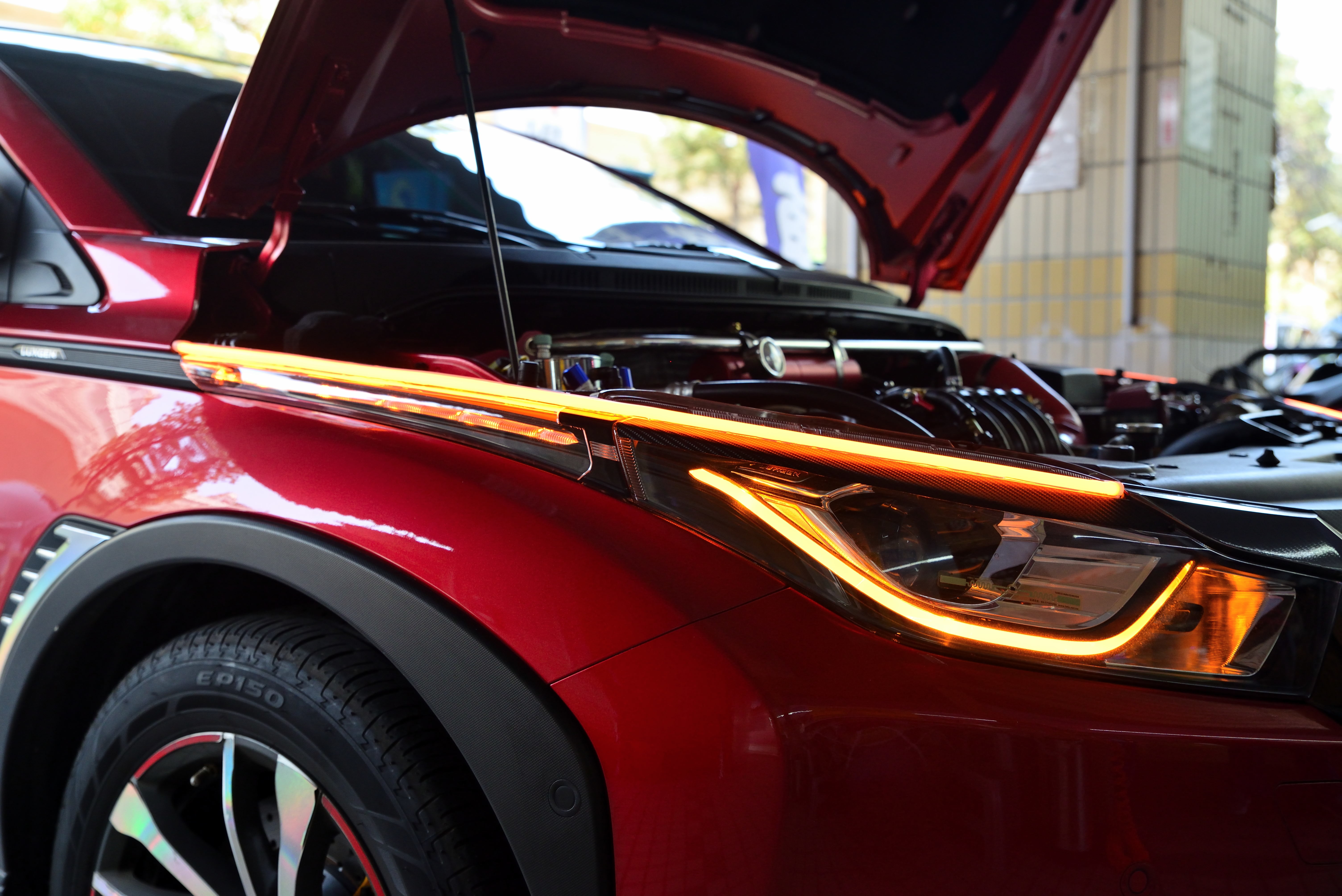 A:流水條很帥但閃爍亮度會有時間差,後面亮起的時候,前面的燈條會暗一下,所以才會使用和原廠同步的雙色導光條嚕。