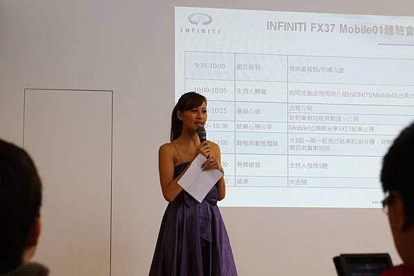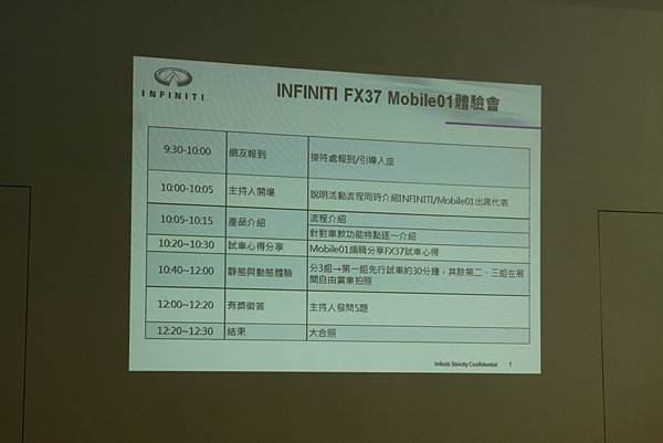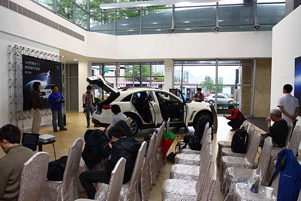 感謝01&行銷媒體給予這一次的機會可以參加正在上市的熱門車種FX37 白色閃電的賞車會。活動流程中,最讓人感到期待的就是動態體驗!! 當然FX37 白色閃電在展示廳,由其他的同型的試乘車擔任。