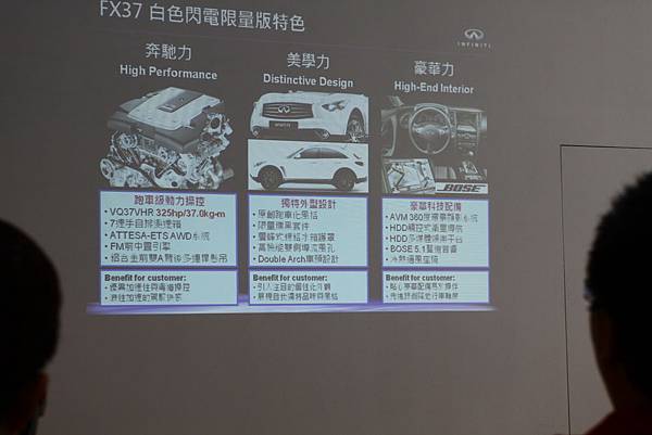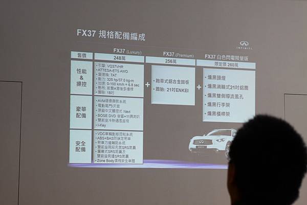 接下來看到的是FX37的售價部分~ 真的看完之後那 FX37 白色閃電的價格還真的是相當划算優惠啊!! 那組21吋的鋁圈跟義大利車系藍寶堅尼是出於同一家工廠的! (該資料由Infiniti FX37 行銷經理提供)