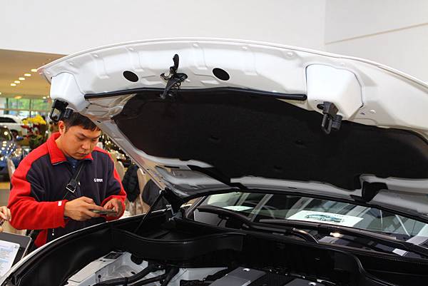 再來~引擎蓋的雙扣設計,也是Infiniti特有的,無疑地這樣也讓汽車引擎蓋固定的更牢固。 該有的引擎是隔熱棉也絕對不偷!!~
