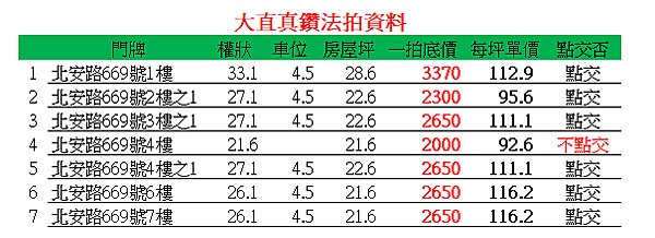 『大直比漾』社區門牌為北安路669號,屋齡兩年,總戶數僅16戶,挑高3.6米,戶數少相對單純,依據實價登錄價格來看,成交行情大約85-90萬,這次一口氣拍賣7戶,數量幾乎佔了社區的一半,短期內勢必將影響社區整體房價,一切得等到法拍的這幾戶完全去化完後才可能回復正常買賣價格。
