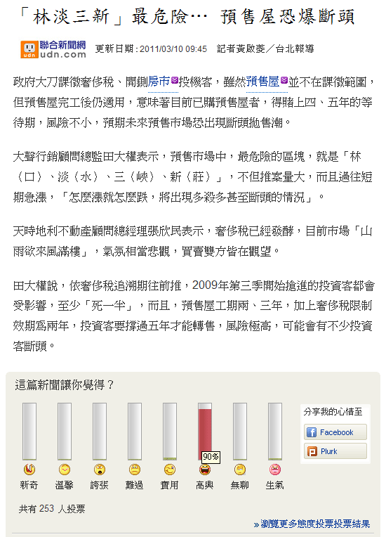 bis0815 wrote:我不認為會打趴推出政...有一本書叫做窮爸爸,富爸爸....(恕刪) 很懷疑你真的看過《窮爸爸,富爸爸》或者你看的那一本書作者不是羅伯特.清崎?讓你做出決定的,到底是「事實」還是「建議(可能性)」呢?01. 房價永遠不會跌,就算會跌也是盤整小跌!02. 政府不可能讓房市大跌!03. 失業率不可能上升,因為政府不會讓失業率上升!04. 黃金是世界上唯一的資產!05. 房子如果是買來自住的話,買什麼價格都沒差!06. 美國國會議員都沒有房屋資產,所以美國房價自2006年高點以來跌了30%以上!07. 台灣立委議員都有房屋,所以台灣房價不可能會跌!08. 台北外來人口多,需求強勁,所以房價只會升不會跌!09. 政府一定會救房市!10. 房屋是你一輩子的資產!11. 台灣房市不可能會泡沫化!12. 房市是經濟成長的火車頭!13. 瘦的人身體才健康!14. 中華電信門號的手機打市話一定比較便宜!................這次奢侈稅的影響確實很難說有沒有效用,但因此長期的看多未來30、40年的房市未免不切實際....這幾年房價會漲會跌很難說,說不一定會繼續漲,這樣的奢侈稅不見得有甚麼作用但是因此跑來跟你說「房價只會漲不會跌」的人,不是傻子就是瘋子,不過有更大的機會是個「騙子」
