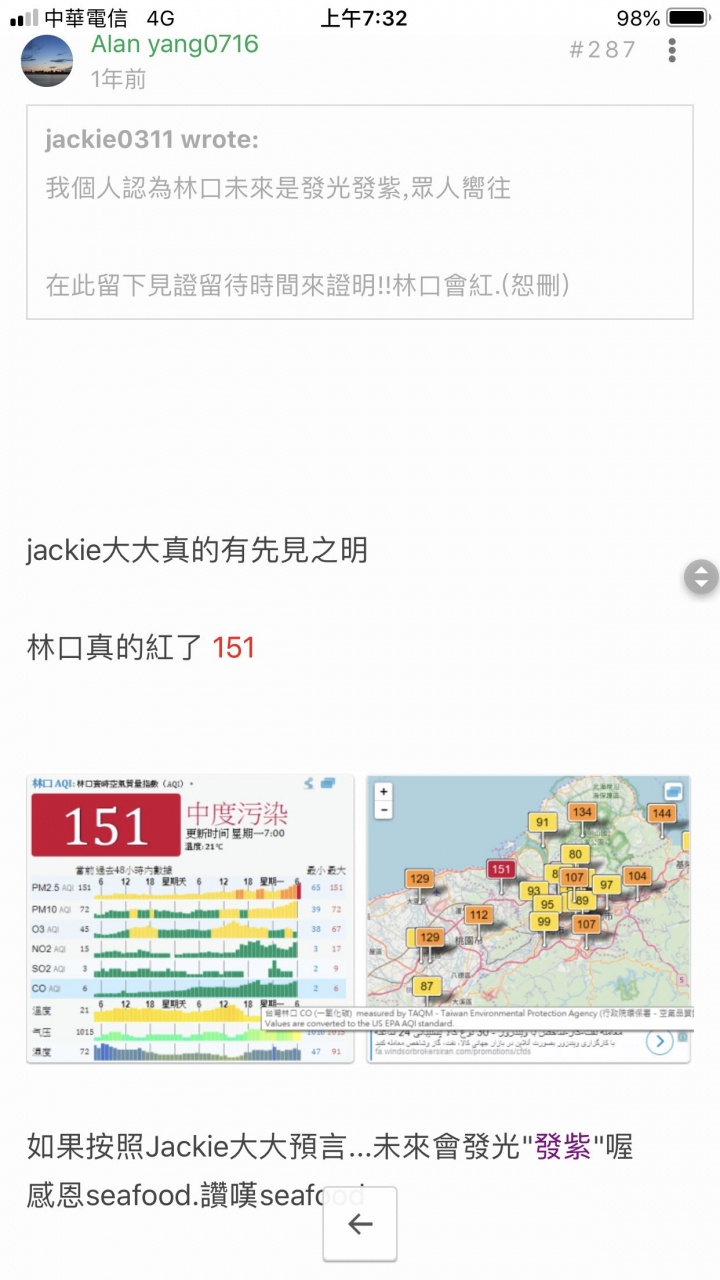 i.BD wrote:你沒引用他的圖?(...(恕刪) 圖的日期早就確認過了,就是那一天的沒有錯。就算我引用他的文,我也是認同他的說法而已,因為我看到的AQI圖表內容是一樣的,A大看到的也是一樣的。這個網站非常容易找,現在為了辯而辯,反倒開始侮辱起自己和林口幫眾當時的智商起來了?更何況,還有這張圖背書哩