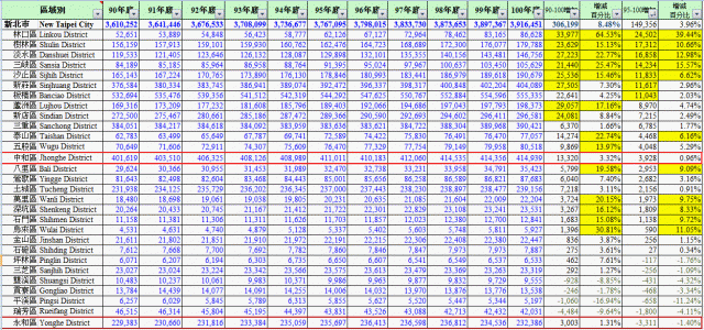 附上近十年新北市(台北縣)各行政區的人口變化,