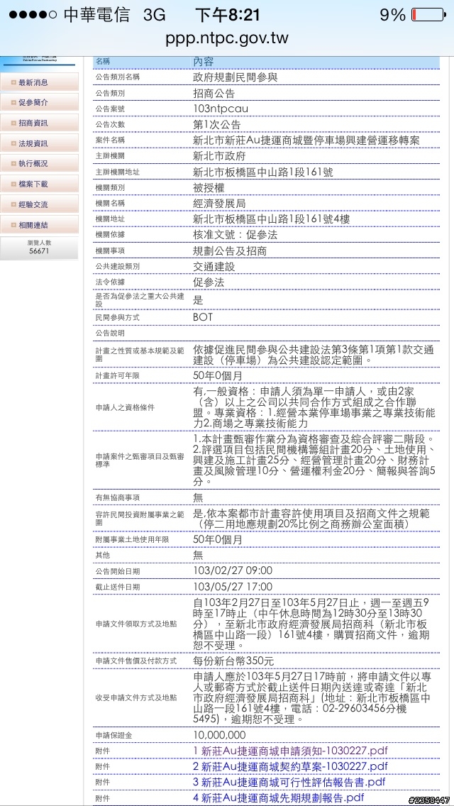 新北市新莊Au捷運商城暨停車場興建營運移轉案http://ppp.ntpc.gov.tw/AP03.aspx?id=1666&Number=103ntpcauhttp://www.economic.ntpc.gov.tw/www/upload/cht/attachment/f8255bf80dc893a0fb2934cab6f3d586.pdf公告開始日期103/02/27 公告截止日期103/05/27簡單的說,Au捷運商城 BOT已開始收件了,有意願投標者,需在5/27以前送件.