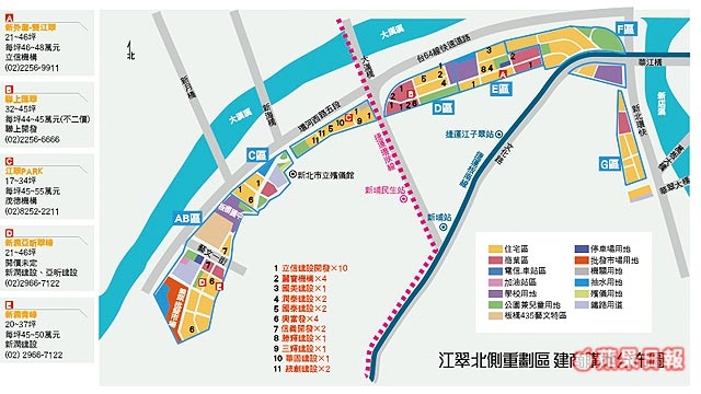 分享江翠北側重劃區 鄰市區機能足 4字頭吸睛2017年10月21日 蘋果日報水岸住宅 休憩機能升級政府近年極力於河川整治,不僅打造綿延的自行車道,更有不少休閒設施,河川旁一改以往淹水凌亂景象,成為充滿休閒氣息的親水宅,本周《地產王》帶您到新北市的江翠北側重劃區、華中橋西側重劃區及新竹縣竹北市,一窺水岸重劃區。採訪╱連珠君、黃立宇 攝影╱林琨凱【連珠君╱新北報導】新北市板橋區最後1塊大型重劃區江翠北側重劃區,位於大漢溪、淡水河及新店溪的交界處,呈現L型的狹長狀,擁有長達5700米河岸,吸引多家知名建商如國泰建設(2501)、潤泰新(9945)、興富發(2542)等建商插旗,去年以4字頭打出名號,在低迷的房市中開出紅盤。江翠北側重劃區面積達82.1公頃,沿河岸開闢,近華翠橋、萬板橋、華江橋、大漢橋及新海橋等5座橋樑,還有新北環快、台64線等2條快速道路,聯外交通便捷。甲山林廣告副主委林振傑表示,一般重劃區都有機能不佳的問題,但江翠北側重劃區緊鄰舊市區,步行就可滿足採買機能。去年首推案茂德機構「江翠ONE」,開出4字頭破盤價,震撼市場,即使房市低迷,半年內就完銷,僅接著聯上建設推出「聯上涵翠」也以4字頭價位完銷,今年初新潤建設也接續推出第3案「新潤青峰」,3案皆為40坪以下小宅。捷運綠地皆齊全這3家建商今年也陸續推出第2案,包括「江翠PARK」、「聯上匯翠」及「新潤亞昕翠峰」,該區最大地主立信機構今年也加入戰局,推出「新外灘-雙江翠」,坪數皆在50坪內,不乏10多坪的規劃,4案開價依舊維持在4字頭,有業者坦言,民眾現階段只能接受4字頭價位。除銷售中的建案外,也有不少接待中心正在興建,林振傑指出,申請中的建照達20、30張,包括興富發、國泰建設等都在請照中,預計到明年第2季前還有不少建案會陸續推出。該區分為AB、C、D、E、F、G等區,因地形狹長,分屬不同生活圈,「新外灘-雙江翠」專案經理蔡孟儒指出,D、E區腹地最大,有3個街廓,公園綠地也最多,且最近捷運站,步行可達江子翠站、傳統市場及江子翠商圈,本案面2000坪公園,建商立信機構還預計推出「仰真」跟「新月天地」,「新月天地」預計年底前公開。CD區近新埔商圈大漢橋兩側的C、D區則近新埔商圈及捷運新埔站,捷運環狀線預計2018年底完工,屆時將更近捷運新埔民生站,林振傑指出,C區以南的水岸已無高架橋遮掩,親水性更佳,「江翠PARK」位於水岸首排,17坪可規劃2房,總價千萬元內可買2房含車位。AB區雖然距離捷運站最遠,但有307公車總站,每個社區將都設置YouBike站,鄰近中正路商圈,及新北市唯一的435藝文特區,也是該區最近新板特區的區位。「新潤青峰」專案經理陳沛諄表示,AB區為永翠綠能特區,設置太陽能路燈,「815停電的時候,整個重劃區黑暗一片,只有永翠綠能特區的路燈是亮的。」目前僅F、G區尚無推案,鉅森建設「河藍」已在搭建接待中心,建照也在申請中,將是F區首推建案,G區因周邊較無機能,目前尚無建商進駐,業者指出,G區除音樂公園旁外,其它地區並不看好,此外,新海橋旁的新北市立殯儀館周邊區段,銷售抗性不小。【江翠北側重劃區小檔案】◎範圍:東及北側以環河西路為界,西側為板橋浮洲都市計劃區,南側至長江路一至三段◎面積:約117.5公頃,扣除都更區4.5公頃、藝文區4.66公頃,已開闢公設用地26.17公頃,整體開發區域82.1公頃◎開發計劃.分AB、C、D、E、F區.預計移入居住人口2.4萬人◎聯絡交通.鄰近華翠橋、萬板橋、華江橋、大漢橋及新海橋等5座橋樑.鄰近快速道路有新北環快、台64線.近捷運江子翠站、新埔站,未來近捷運環狀線新埔民生站,預計2018年底通車.中正路、文化路及新海路有公車行經◎環境.AB、C區近中正路商圈,AB區規劃為永翠水岸綠能特區.C、D區近新埔商圈.D、E、F區近江翠商圈.近大漢溪河濱公園、435藝文特區、果菜批發市場、新月橋等◎學區.國小:江翠、新埔國小.國中:板橋、江翠、新埔國中資料來源:《蘋果》採訪整理