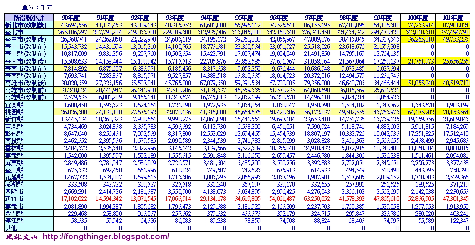 十年來的各縣市所得稅(包含『營利事業所得稅』與『綜合所得稅』兩種)的統計資料.90年~101年度各縣市歷年所得稅統計資料大家可以看看改制前台中市, 台南市與新竹市的所得稅的比較, 尤其是新竹市的人口數只有三四十萬,台南市是六七十萬, 台中市從七十多萬成長到一百萬左右, 但繳的稅比新竹市還少, 就算是合併後來算只有 101 年度台中市(合併後)小贏新竹市一點, 但輸給新竹縣市合併.但是補助呢 ? 而且台中台南都合併升格了 !連結文章內還有『營利事業所得稅』與『綜合所得稅』的各別比較表, 就不貼於此了. 新竹市不是只有『綜合所得稅』比台中台南多, 『營利事業所得稅』也是比改制前的台南還多, 96 年度開始就比台中市還多.