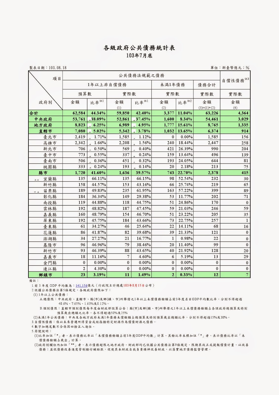 nszaa wrote:對了,竹竹苗如果合併,那苗栗的錢坑就要由新竹照單全收嘍~ 其實大家只要看一下各縣市負債表,就會看到就算竹竹苗三縣市加起來,大概七百多億,上頭還有新北高雄與台北,而且以新竹的創稅能力,若依照直轄市的比率來重新編列,這些債務根本算不上是問題。各縣市負債情形 (統計至 2014 七月)
