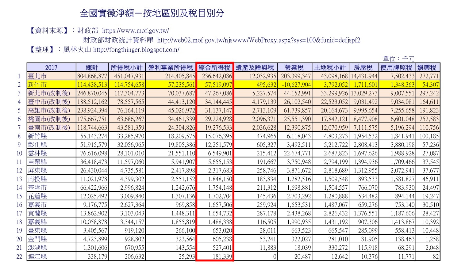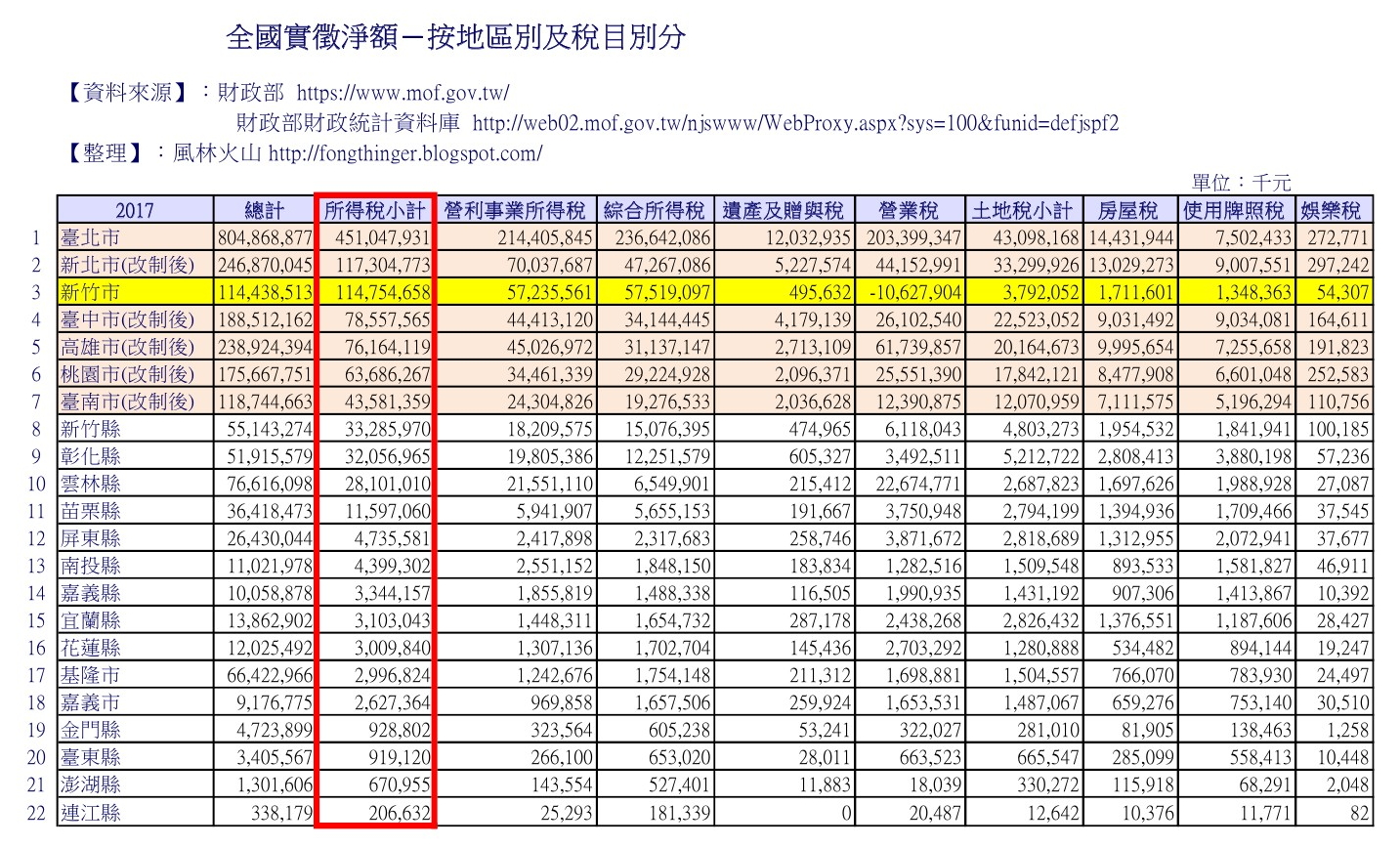 這是所得稅,怕會有不公平的地方會在台北市有許多企業集團的高薪階級所在,更是收入前段班的人登記在那,所以高低差異會非常大,而新竹市及新竹縣(其實主要在竹北市)的收入高低差異不會那麼大,不過仍能在家庭收入前2-3名,表示均收入客觀