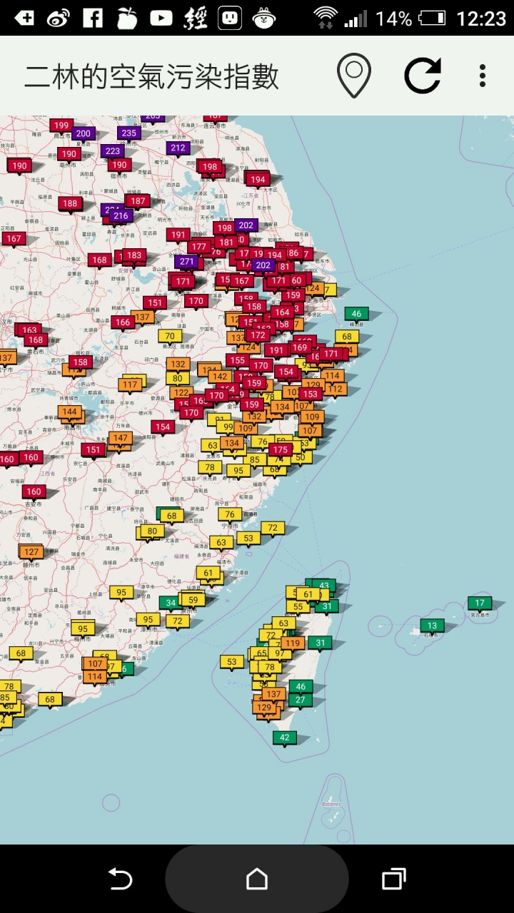 第二張圖是中國pm2.5的「擴散圖」,一直到下午三點,台灣本島(包括淡水)的顏色還是pm2.5最低的深藍色,表示全台幾乎不受對岸pm2.5的影響