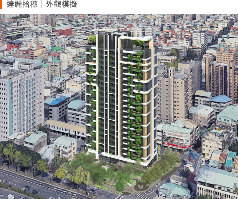 該案的宜居建築規劃,塑造成一座城市中的森林,近20米退縮花園給繁華的城市森呼吸的空間,也創造絕佳視野,也因其地段的獨特性,位於台中捷運綠線與藍線十字軸線旁,規劃一座台中市難得的雙捷運綠建築,成為城市發展的新典範。